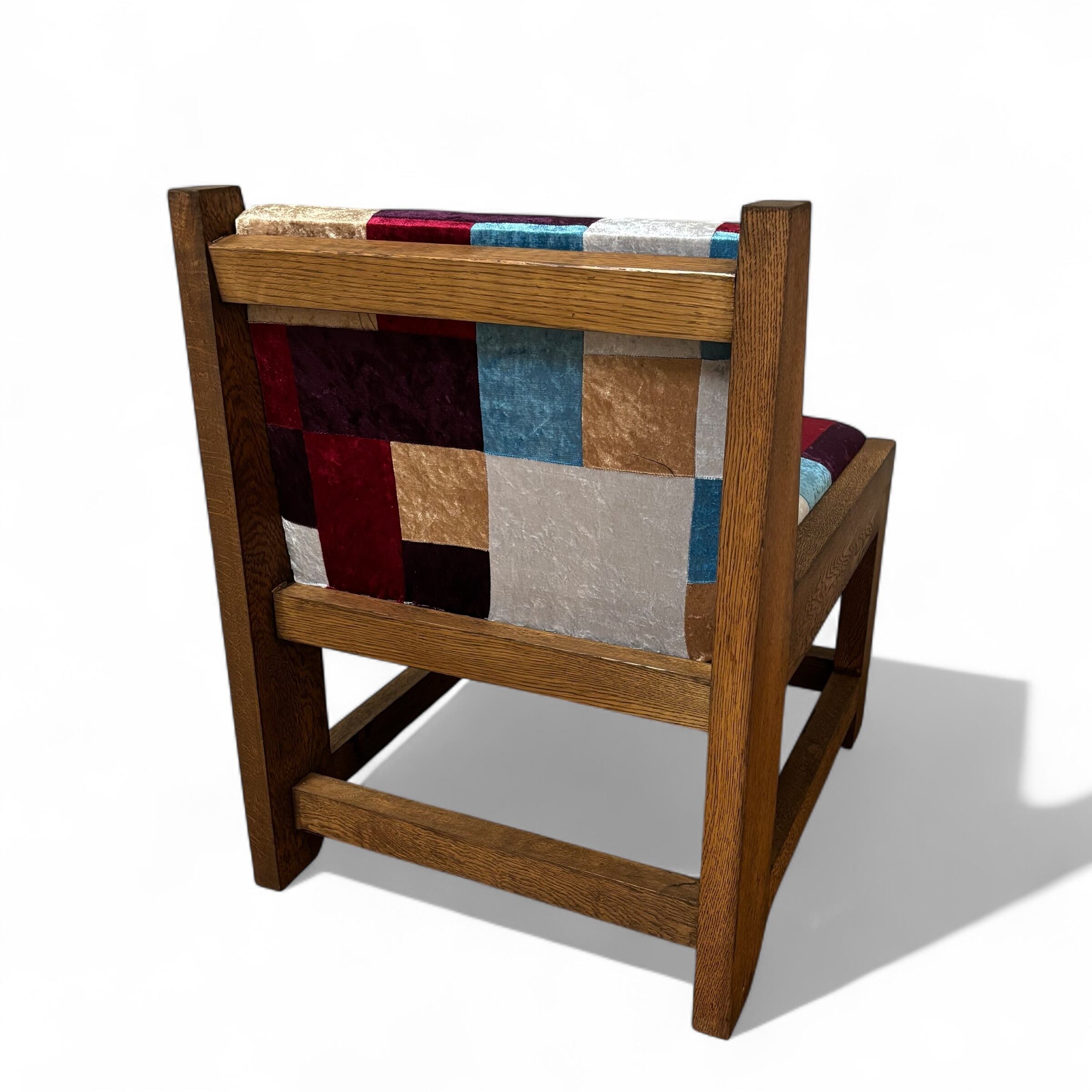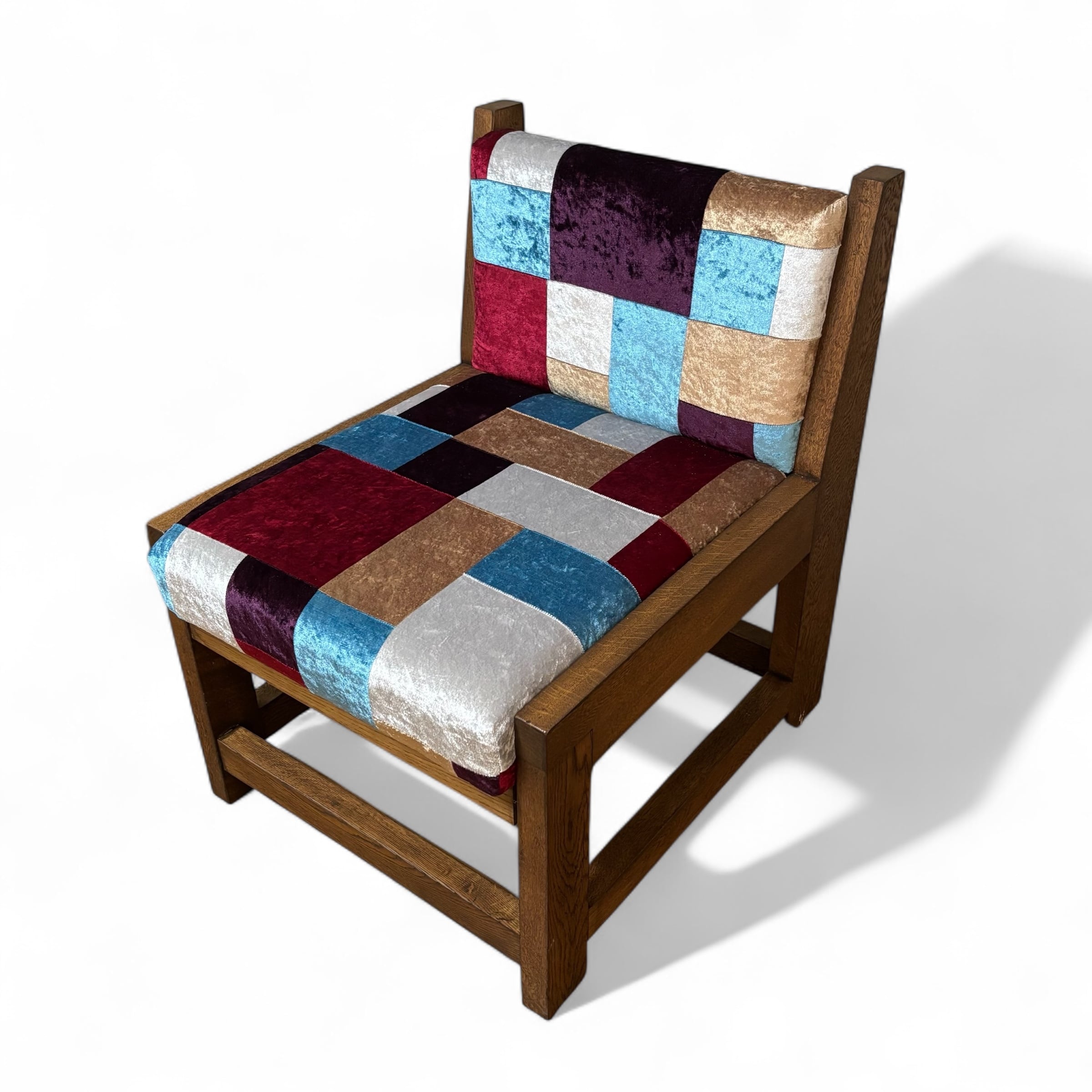 重厚なチェアフレームに、5色のクラッシュベロアを大胆に組み合わせたパッチワークチェア。