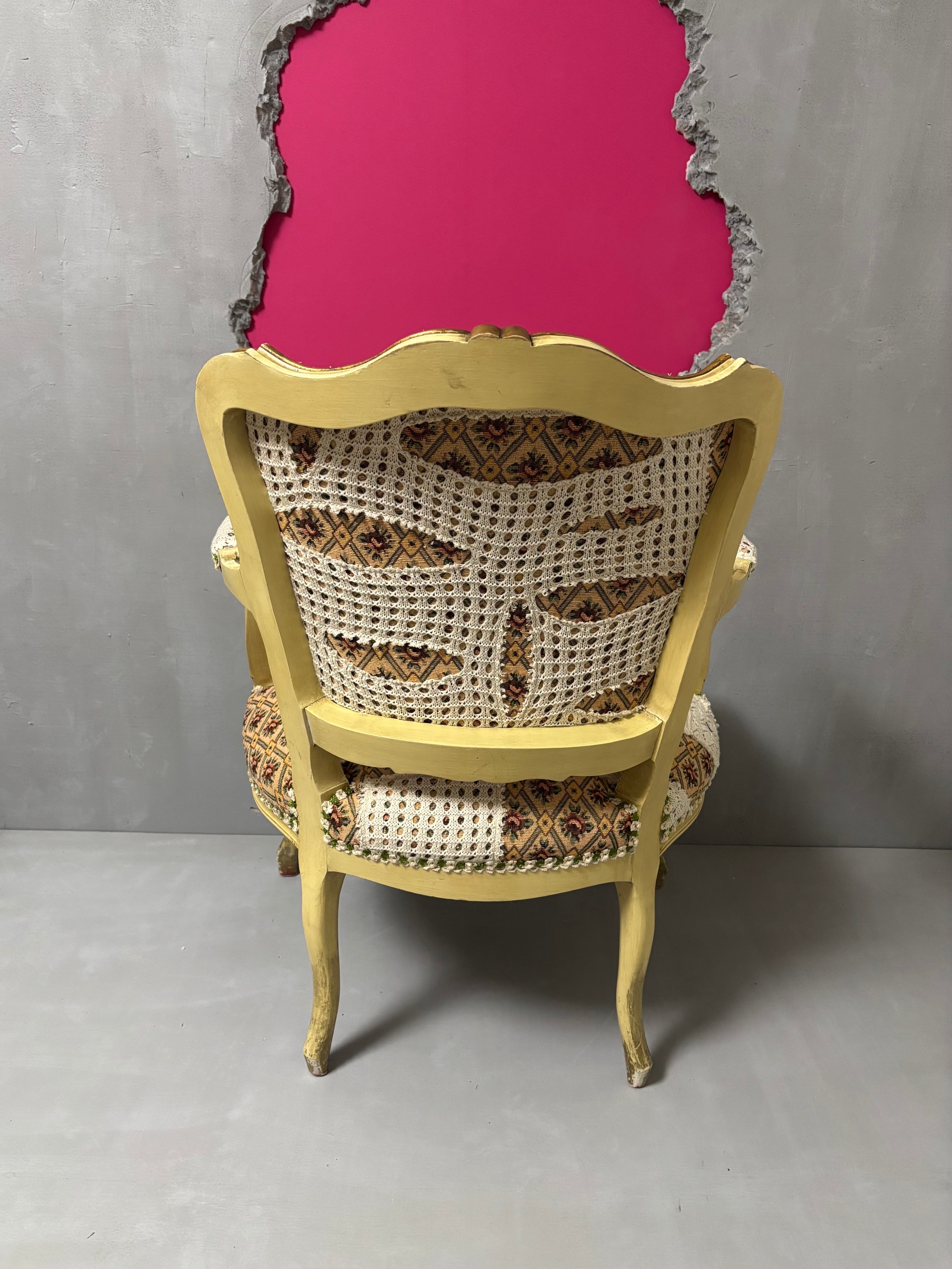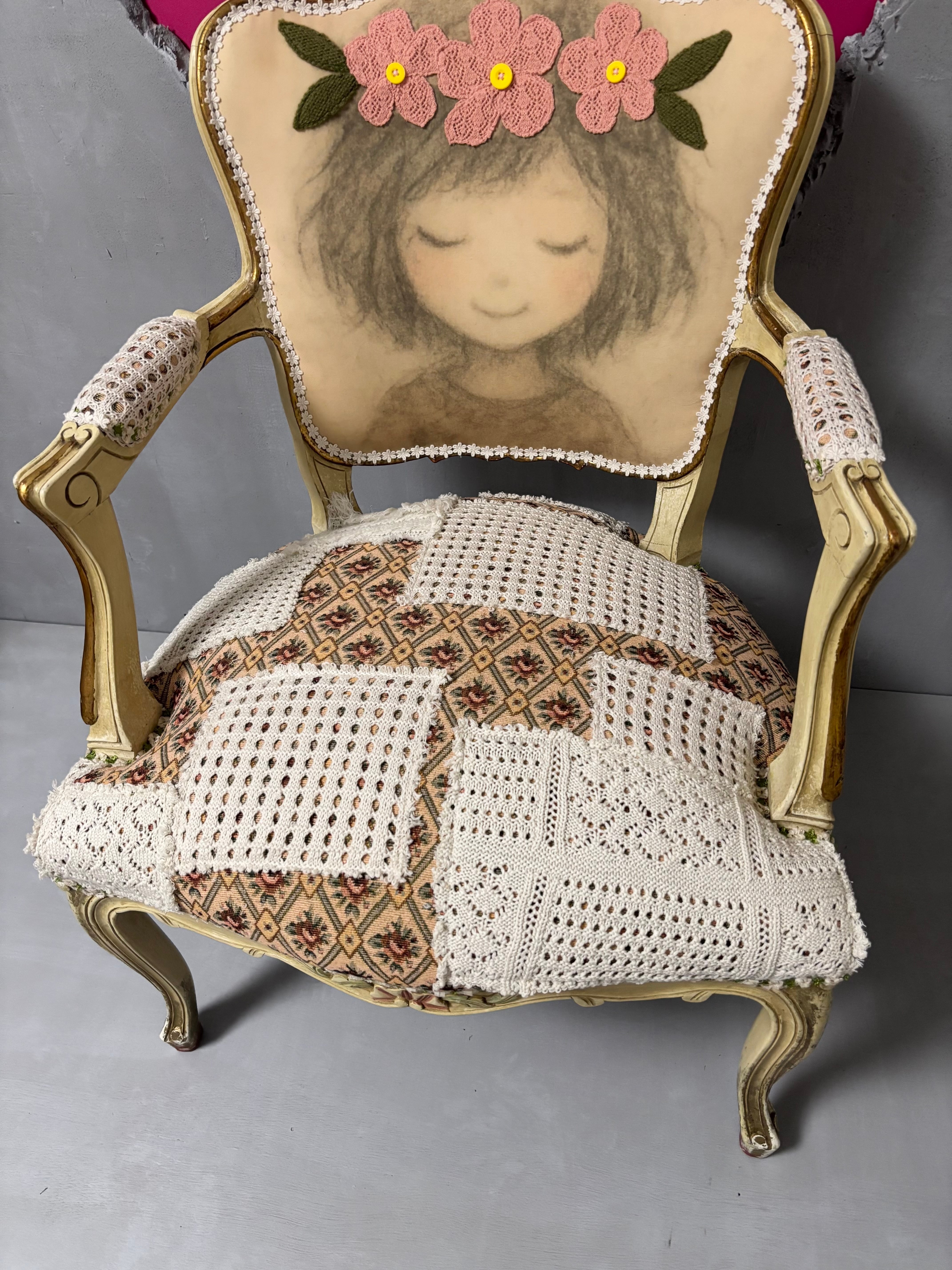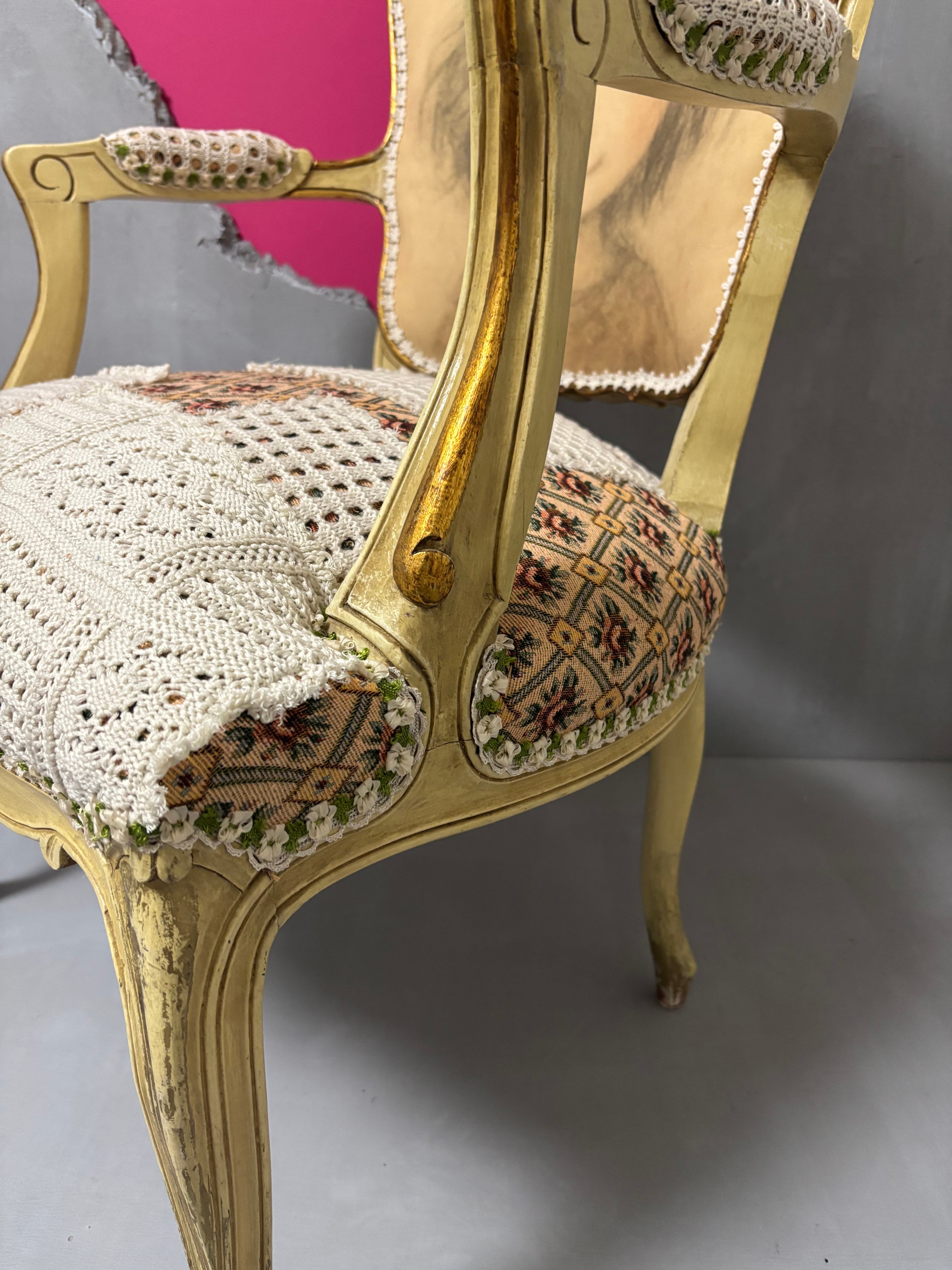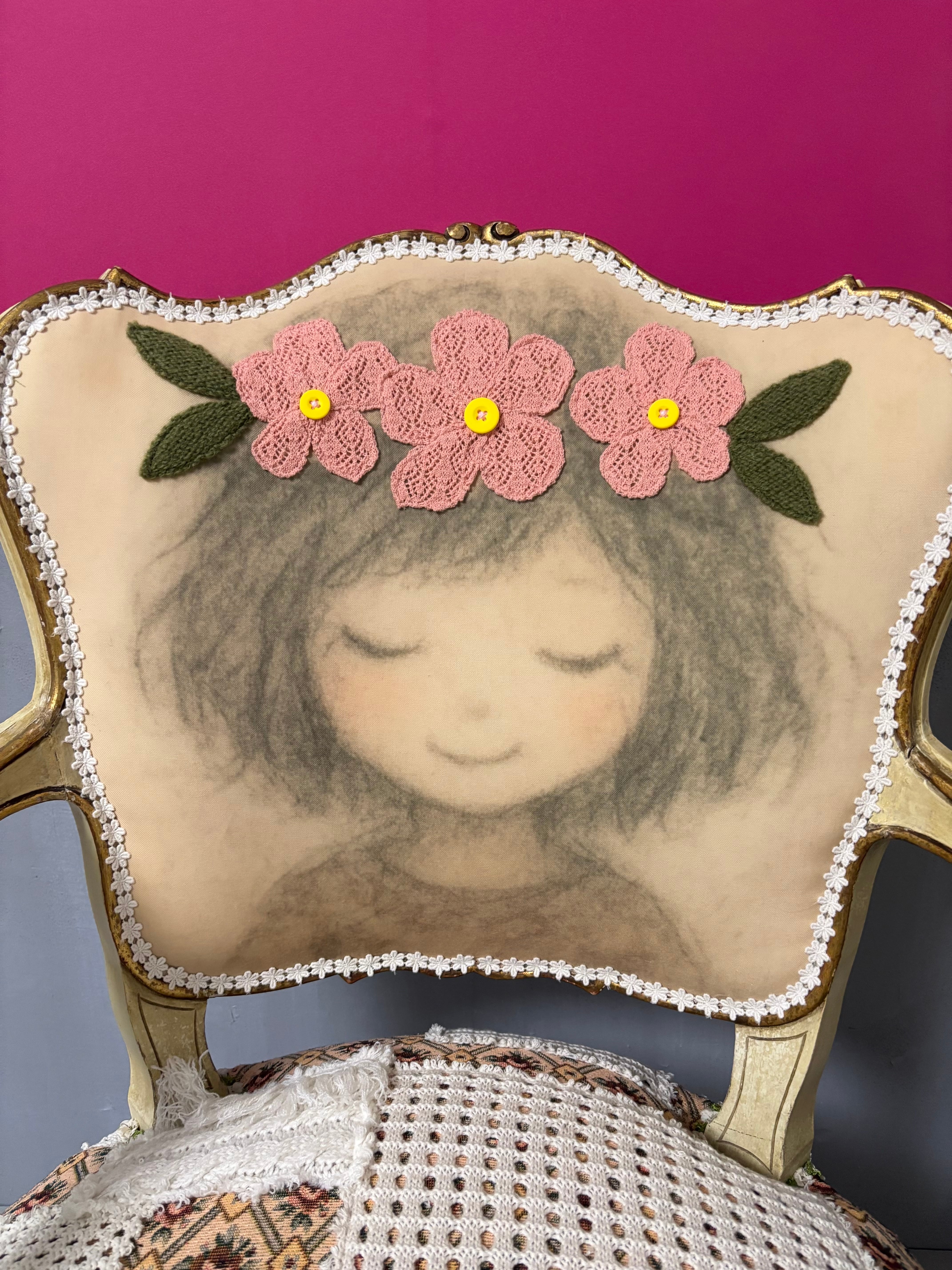 座面と肘掛けには、花柄のゴブラン生地にニットを縫い付け、